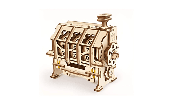 La maqueta “Contador” registra acciones repetitivas. Forma parte integrante del dispositivo llamado “cuentakilómetros”. Incluye una cruz de Malta y tres engranajes fijados a ruedas que llevan grabadas las cifras 0 a 9. Esta combinación de piezas le permite observar una interesante característica mecánica: la conversión del movimiento lineal del pulsador unido al mecanismo de la cruz de Malta en movimiento giratorio de los engranajes y ruedas con los números. El contador ofrece dos opciones de registro de datos: el pulsador en la parte superior de su cuerpo y una manivela giratoria en un lateral. Al pulsar el pulsador o girar la manivela, el contador avanza una unidad. Cuando ha llegado a 9, la cruz de Malta engancha la siguiente rueda registradora y suma su valor al recuento. En total, el indicador de tres cifras del contador puede marcar valores comprendidos entre 1 y 999. Puede abrir la tapa frontal del contador y reiniciarlo manualmente. Intente contar los pasos que da para ir a su casa o el número de personas que cruza en su paseo por el parque. ¿O qué le parece la cantidad de coches azules que pasan delante de su casa durante una hora? Cuente los peldaños de su casa, en la escuela o en la casa de un amigo.