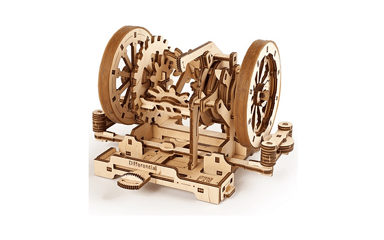 El diferencial es una maqueta didáctica y una herramienta de estudio interactivo del mecanismo, con el único fin de aprender sus fundamentos y principios de funcionamiento. El diferencial fue diseñado para que las ruedas motrices montadas en un mismo eje giren a distintas velocidades y cubran distancias diferentes al mismo tiempo. Gracias a este mecanismo, el coche gira sin que las ruedas patinen, se evita el bloqueo de las ruedas, se reduce el desgaste de los neumáticos y facilita al conductor la entrada y salida de las curvas. Tras ensamblar el diferencial, puede desbloquearlo empujando la palanca a la posición 1 (arriba) y poner ambas ruedas en movimiento al girar la corona o la rueda. La palanca de mando regula el bloqueo suave independiente de las ruedas izquierda y derecha según se gira a la izquierda o a la derecha respectivamente. Con la palanca en la posición “abajo”, ambas ruedas se unen en un acoplamiento rígido y pueden girar al mismo tiempo (impulsadas por la corona o una rueda) o bloquearse simultáneamente (mediante la palanca de la rueda).