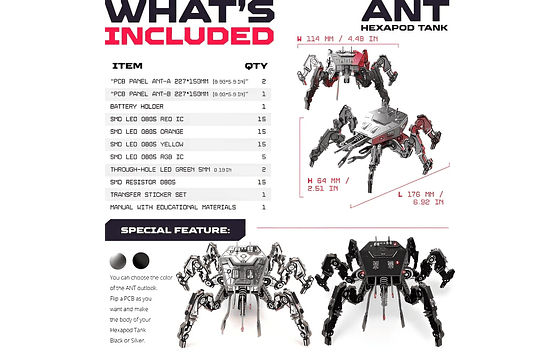 Obtén el kit de construcción de robot de tanque Cyberpunk ANT001: ¿por qué seis patas? Nuestro tanque ANT001 es un hexápodo, lo que significa "seis patas" en griego, para una mayor estabilidad y una adaptabilidad inigualable en el campo de batalla, incluso si una de las piernas está comprometida.