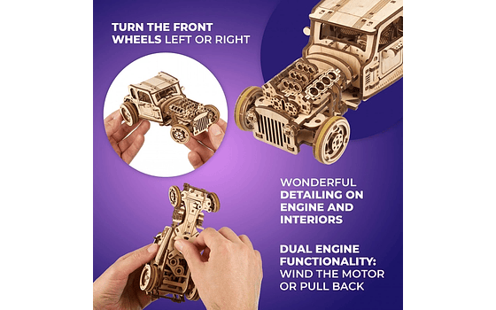Gire las ruedas delanteras de su Hot Rod hacia la izquierda o derecha para que haga graciosas curvas, o déjelo correr en la recta. Otras características del Hot Rod El Ratón Furioso de Ugears son la escala realista, los maravillosos detalles en el motor y en el interior del vehículo, así como las puertas tipo Twindoors con mecanismo de cierre y manilla.