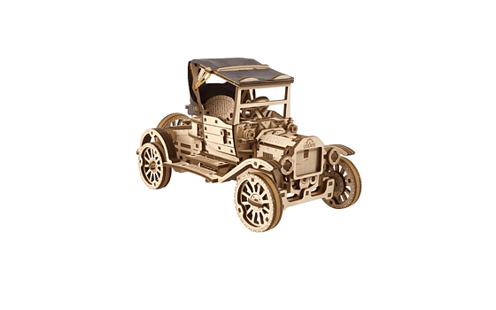 El equipo de diseño e ingeniería de Ugears ha desarrollado un modelo de un automóvil clásico y especial que le trasladará a aquellos tiempos. Las características destacadas incluyen el techo plegable cubierto de tela, puertas que se pueden bloquear y se abren para salir hacia delante, el capó que se abre en ambos lados, dejando a la vista el motor de 4 cilindros con cigüeñal operativo, un péndulo que imita el sonido del motor, ruedas delanteras que se pueden girar mediante el volante, y una rueda de repuesto montada en la parte trasera. Para poner en marcha su Automóvil Retro UGR-T, en primer lugar ponga el botón Start/Stop en su posición de “Stop” y de cuerda al motor propulsado por un resorte, utilizando para ello la llave incorporada debajo del chasis. A continuación, coloque la maqueta en una superficie plana y sujetándola con una mano pulse “Start”. Ahora suéltela y observe como el coche se aleja. El automóvil tiene marcha adelante, atrás y punto muerto.