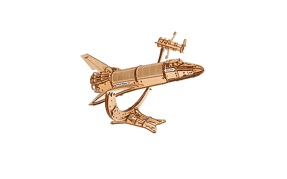 El apoyo del Transbordador utiliza tensegridad (integridad tensional o compresión flotante), un elegante diseño de ingeniería estructural que permite que la maqueta se sostenga sobre unos finos hilos de pesca por encima del apoyo, como si estuviera flotando libremente en el espacio. Mediante un mecanismo de trinquete en el mismo apoyo podrá ajustar la tensión de los hilos. Podrá cambiar manualmente el cabeceo de la nave espacial hacia arriba y abajo tirando de los hilos de tensionado, o ajustar el balanceo de la misma hacia la izquierda y la derecha, moviendo el apoyo con la mano o utilizando el mecanismo de trinquete localizado en el apoyo. Otros elementos funcionales del Transbordador son los alerones móviles en las alas del orbitador, timones móviles y un tren de aterrizaje retráctil.